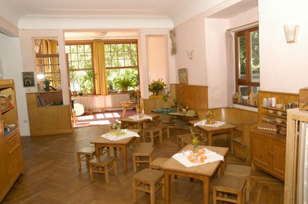 Durch behutsame Umbauten der ehemals herrschaftlichen Villenzimmer wurden große, gepflegte Gruppenräume für die Kinder geschaffen, in denen durch abgehängte Tücher Puppenecken, Kaufmannsläden, Bauecken und Spiellandschaften entstanden sind.