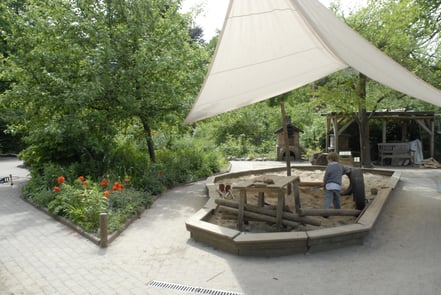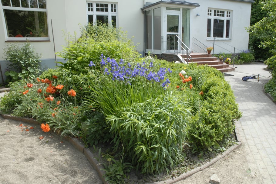 Täglich und bei jedem Wetter spielen die Kinder in dem großen Garten, der die Villa umgibt. Dort finden sie zwei große Sandkisten, eine Schaukel, eine Rutsche, ein Spielhäuschen und ein großes Holzschiff, das Eltern des Kindergartens gebaut haben, sowie viele verwilderte Ecken, in denen in Erde und Lehm gebuddelt oder Verstecke gebaut werden können.