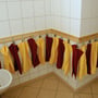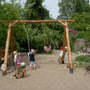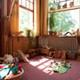 Neben Puppen, Kaufmannsladen und kleinem Geschirr finden die Kinder dort allerlei natürliche Spielsachen, die zum fantasievollen Spielen einladen, darunter Körbe voller knorriger Wurzeln, Muscheln, Steinen, Zapfen und Kastanien. Hocker, Tische, Bretter und große Tücher in den Regenbogenfarben dienen den Kindern dazu, sich in den Räumen Höhlen, Schiffe, Autos oder auch Mondraketen zu bauen.