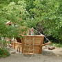 Der große Kaninchenstall in einer Ecke des Gartens begeistert viele Kinder, und sie bringen den Tieren regelmäßig Möhren oder Salatblätter von zu Hause mit. In einem Holzbackofen werden im Spätsommer die Erntebrote gebacken.