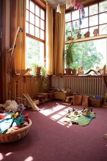 Während sie ihrer Arbeit nachgehen begleiten die Erzieher aufmerksam und liebevoll das Treiben der Kinder in den Spielecken, Häusern und Höhlen und sorgen dafür, dass sich die Phantasie der verschiedenen Kinder aus den Kräften der Nachahmung entfalten kann.